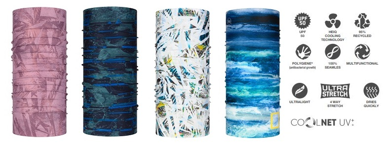 Mit der neuen SS21 Kollektion erweitert BUFF® sein Angebot um weitere neue, nachhaltige und aus recycelten Materialien gefertigte Produkte. Neben Naturfaser aus zertifizierter Merinowolle und Baumwolle stehen auch CoolNet UV+, mit UPF50-Sonnenschutz und kühlenden Materialeigenschaften, das zu 95 Prozent aus Repreve®-zertifizierten, recycelten PET-Flaschen gefertigt wird, im Vordergrund. Neuzugänge gibt es auch im Packable Programm, bei dem neben Baumwolle auch recycelte Materialen zur Anwendung kommen. Die CoolNet UV+ ist eine Technologie die zusammen mit dem Schweizer Unternehmens HeiQ entwickelt wurde, welche nicht nur einen Sonnenschutz von UPF50 bietet sonder einen kühlenden Effekt aktivieren kann.