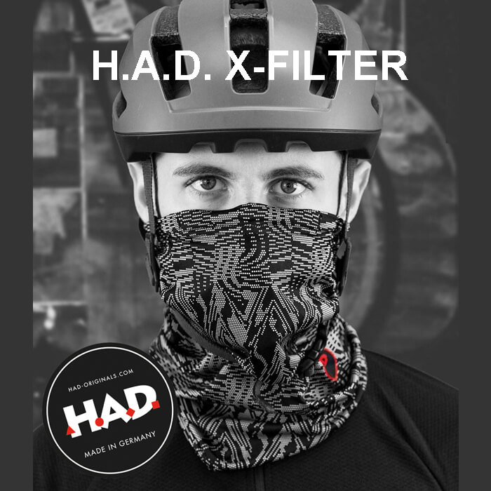 Effektives Filtern von Feinstaub und allergieauslösenden Pollen. Das verspricht das Multifunktionstuch X-Filter des Outdoorherstellers H.A.D. Die Atemluft bleibt “sauber”, dank eines effizienten Filters bestehend aus einem mehrschichtigen Membran-Laminat aus Nanofasern. Die Zertifizierung des Filters, gemäss der Testmethoden ATSM F2100 bzw. ASTM F2100 EN14683, garantiert eine bakterielle und virale Filtereffizienz von 99,9%.