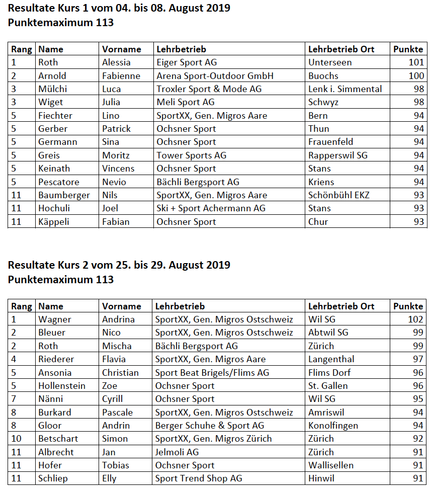 Hervorragende Resultate an den Lehrlingskursen in Filzbach