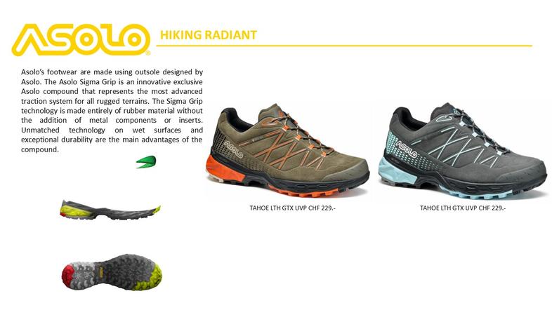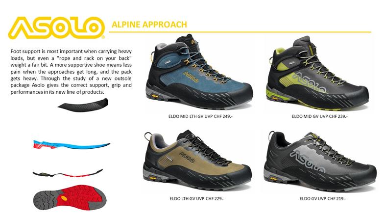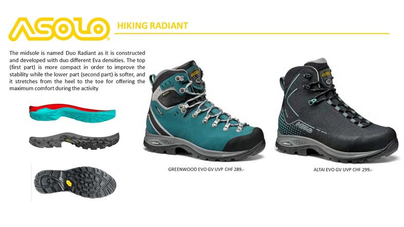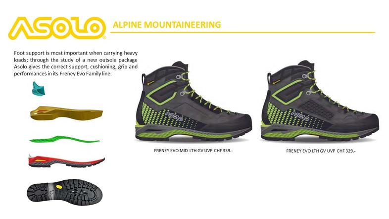 Asolo war immer ein innovatver Vorreiter und eine revolutionäre Idee des Gründers war der erste Bergschuh, der aus einer Kombination von Leder und Textilmaterial (Cordura) gefertigt wurde. Die nächste Entwicklung liess nicht lange auf sich warten und ein Modell mit einer Gore–Tex Membrane wurde auf den Markt gebracht-Innovationen die nicht nur den Markt, sondern auch die Machart von Outdoor Schuhen veränderten.